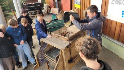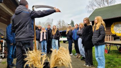 Da staunten die Schüler der 8. Klassen der „Oberschule Johanneum“ aus Hoyerswerda und der Grundschule „Bolesław Chrobry“ aus dem polnischen Nowogrodziec, als der selbst angesetzte Sauerteig plötzlich aufging und sich auf wundersame Weise vermehrte. Zusammen lernten sie beim Projekttag „Vom Korn zum Brot – Das Brot-Wunder“ am 25.11.2025 auf der Kinder- und Jugendfarm ganz praktisch Wissenswertes über Getreide und das Handwerk der Brotherstellung. Folgende Fragen standen dabei im Mittelpunkt:
